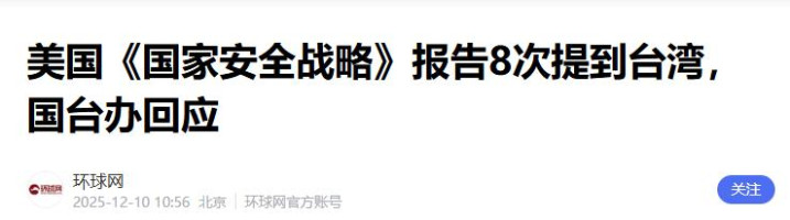 2.《美国《国家安全战略》报告8次提到台湾最新配资门户,国台办回应》2025-12-10 10:56 | 来源:环球网